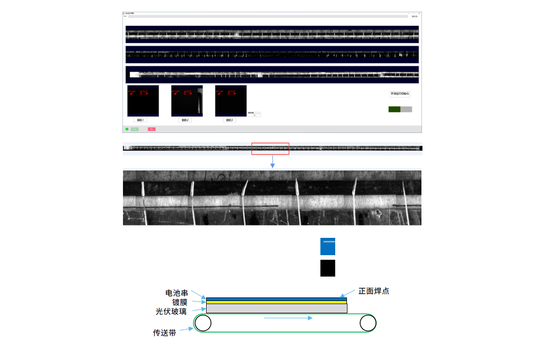 应对产品流出后检测导致大量报废问题,以及终端人员检测遗漏问题,针对汇流焊设备不同工艺,开发了汇流焊焊点在线检测系统,通过深度学习分割焊点,再通过传统算法对焊接饱满度进行量化分析,同时能够支持不同组件的快速换型(20min),简单的参数调节,简洁的Job界面,应用于TOP光伏组件终端。